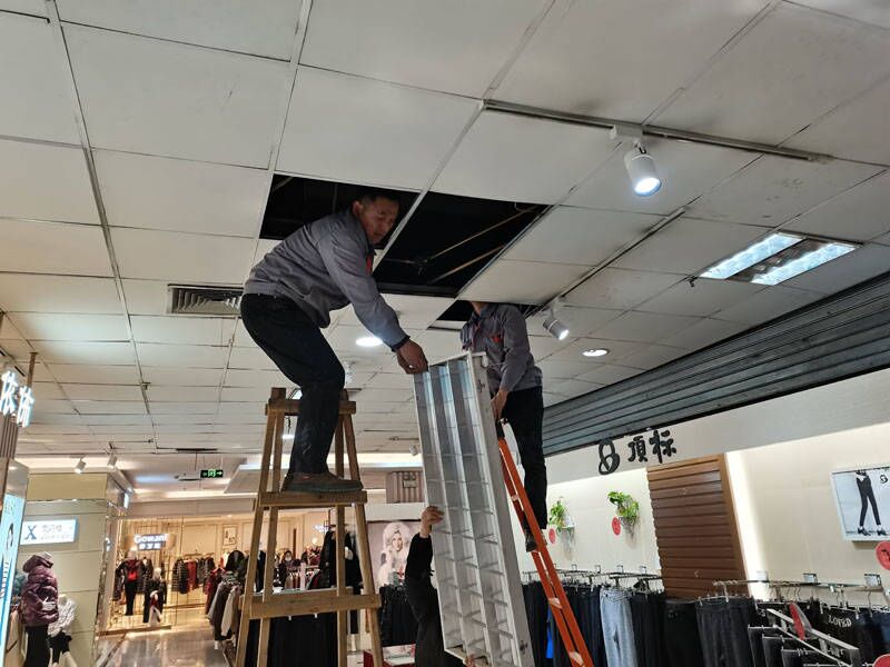 為了讓賣場照明設備既明亮又節(jié)能,后勤保障部電工班同志幾次跑市場找合適燈具,對多處頂部照明進行更換??紤]到頂部天花板的承重等因素,還要對其進行二次加固,所以更換一套格柵燈一個人需要在梯子上忙活近30分鐘,下來時腿腳已接近麻木。二樓扶手電梯頂部損壞的燈具更換起來很繁瑣,距離太高梯子高度夠不著,后勤保障部電工班摸索出了“小妙招”,自制工具輕松解決,而且不影響電梯的正常運轉。